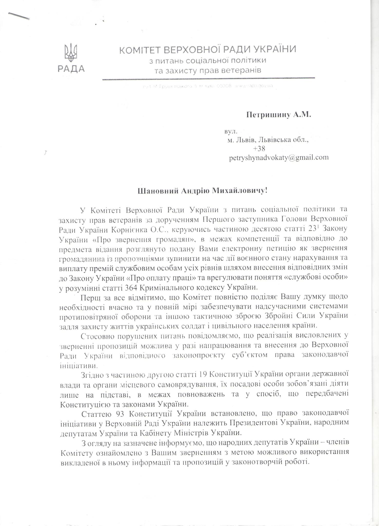 Петришин сообщил, что на днях получил ответ от Комитета Верховной Рады Украины по вопросам социальной политики и защиты прав ветеранов за подписью председателя комитета Г. Третьякова. В ответе говорится, что Комитет полностью разделяет его мнение о необходимости своевременно и в полной мере обеспечивать сверхсовременными системами противовоздушной обороны и другим тактическим оружием Вооруженные Силы Украины для защиты жизней украинских солдат и гражданского населения страны.