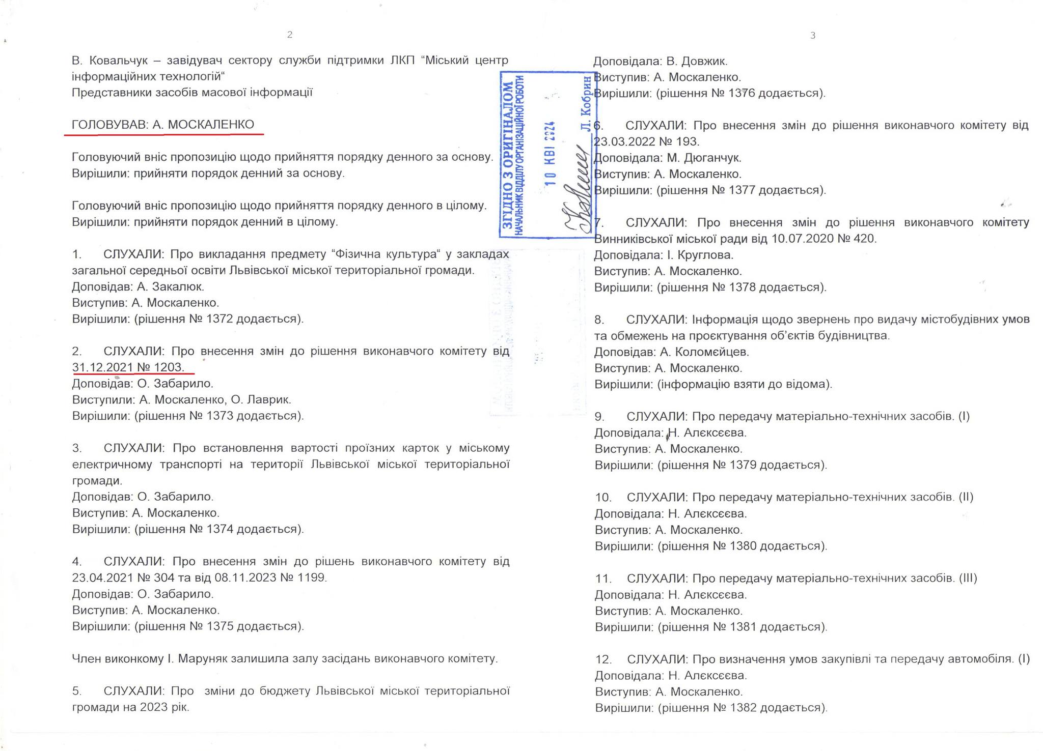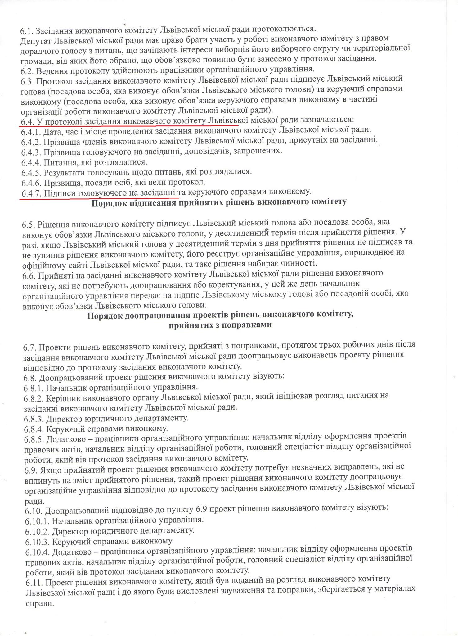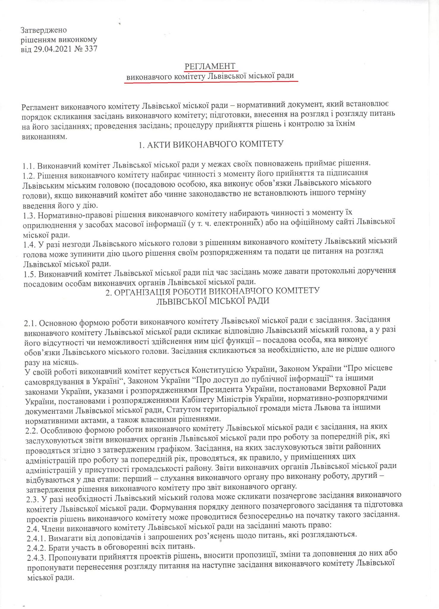 2. Регламент исполнительного комитета Львовского городского совета, которым утвержден Решением Львовского городского совета №337 от 29.04.2021 года, где установлено следующее: 5.2. В случае отсутствия Львовского городского головы председательствует на заседании исполнительного комитета Львовского городского совета первый заместитель городского головы — заместитель городского головы по экономическому развитию. 6.4. В протоколе заседания исполнительного комитета Львовского городского совета указываются: 6.4.7. Подписи председательствующего на заседании и управляющего делами исполкома.
