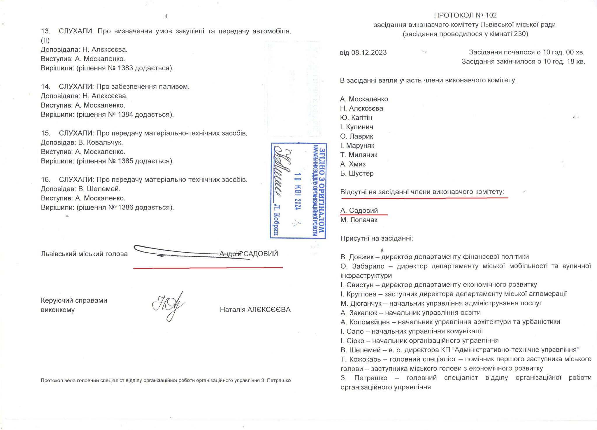 По инсайдерским данным Петришина и его команды в транспортных перевозках крутятся огромные суммы неучтенной наличности, так называемая теневая касса. Львиную долю перевозок осуществляет Львовское коммунальное АТП №1. Которое полностью подчинено Садовому. Против АТП№1 и его директора открывались уголовные производства, но глава города Садовый вместо назначать служебные расследования постоянно защищал директора и называл его эффективным менеджером. Более чем понятно почему! Зададимся вопросом, то почему не подписал протокол заседания исполкома от 08 декабря 2023 года №102 Андрей Москаленко? Опять же по данным команды Петришина, Москаленко понимая, что решение исполкома о подъеме цен на транспорт вполне не обосновано, и это все попахивает криминалом, не решился поставить свою подпись. И тогда Садовый пойдя на уголовное нарушение сам завизировал этот документ. Петришин намерен вызвать в судебное заседание пока в качестве свидетелей первого заместителя — Москаленко, и главу города — Андрея Садового, пусть лично дадут объяснения суду и общине Львова, что было причиной для Москаленко не подписывать протокол заседания исполкома. И что побудило Андрея Садового поставить свою подпись на документе и пойти на преступление. Чтобы виновные понесли наказание распространяйте информацию, комментируйте, а мы работаем дальше. Ниже подаются документы полученные в рамках дела: 1. «Протокол №102 заседания исполнительного комитета Львовского городского совета (заседание проводилось в комнате 230» содержит подпись Львовского городского головы — Садового Андрея Ивановича. Хотя как указано в описательной части Протокола, А. Садовый отсутствовал на заседании 08.12.2023 года.